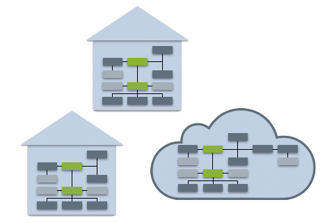 Hybrid solutions bring the benefits of on-premise and cloud solutions together. Big and delicate data is managed in your house. For external communication with your partners and customers, the data is (partially) synchronized to the cloud. For example, video portals or web pages can get their data directly from the cloud instance.