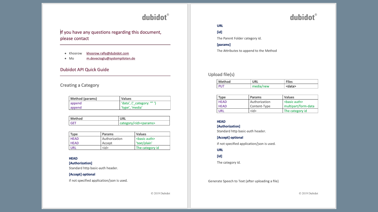 With Dubidot RestAPI, we offer you a documented interface so that you can use it to map your individual workflows on your own interface. The package includes training and familiarization with existing projects, e.g. to build a video portal that statelessly accesses media from Dubidot.