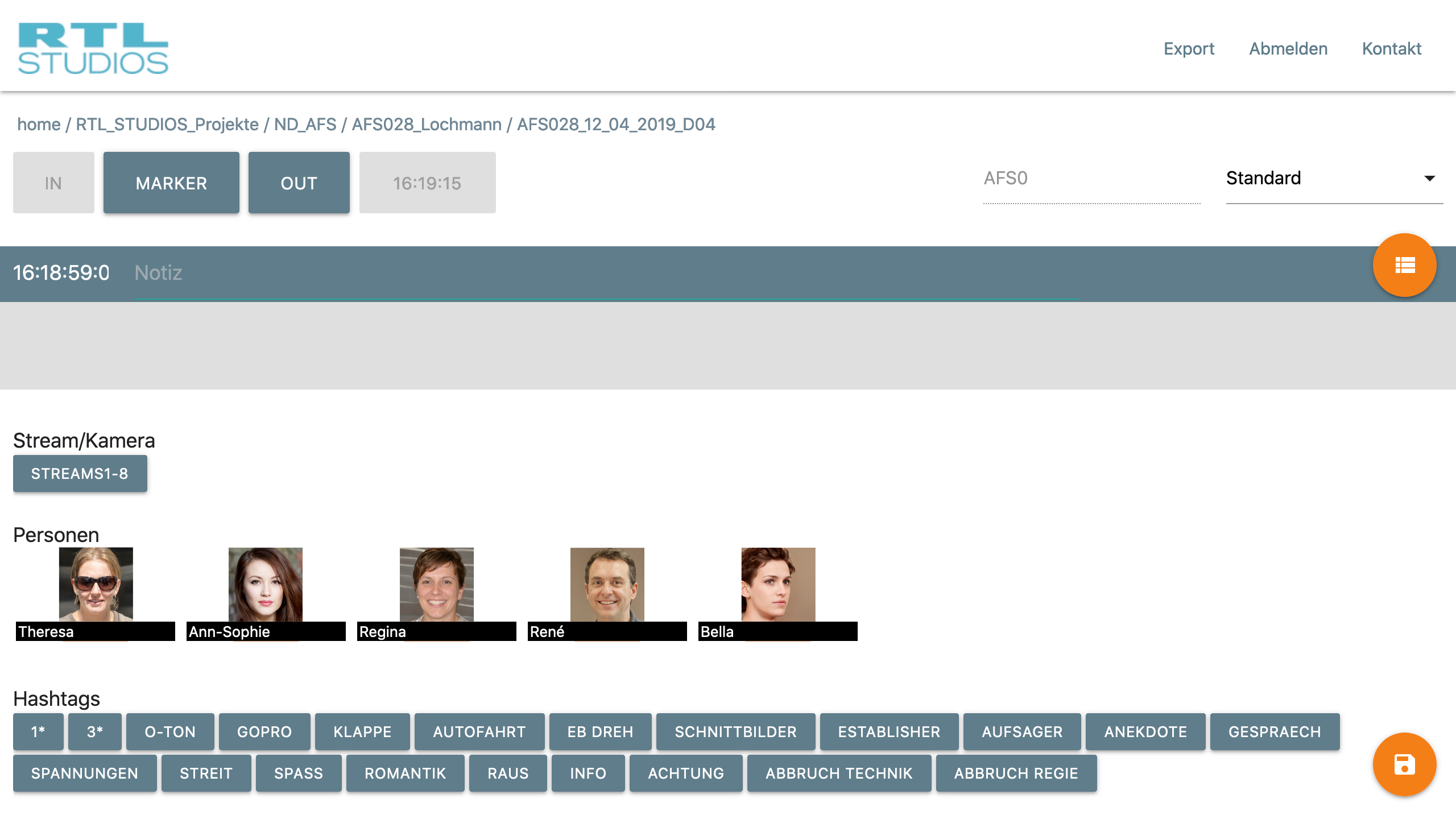 Tag your livestream. You can define hashtags so that the editors can easily carry out a frame-based keywording by clicking on the relevant terms. For entering people, e.g. protagonists and locations simply store images for the respective project that can be selected.